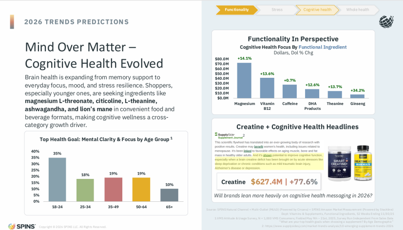 SPINS data shows that “mental clarity and concentration” has become an important health goal for consumers of all ages, with the 18-24 age group showing the highest attention (35%), followed by the 50-64 and 35-49 age groups (both 19%).